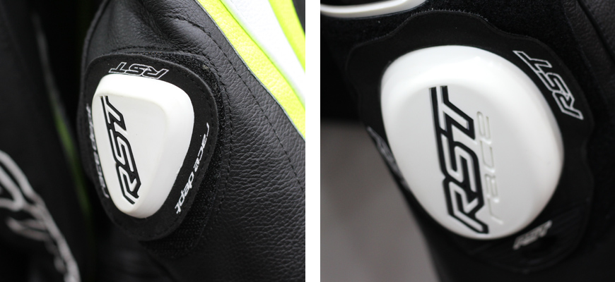 Lo primero que destacamos es que se trata de un mono de fabricacion en piel bobina de 1,2 a 1,4 mm de grosor y que cuenta con homologacion CE de máximo nivel (Triple A), lo quiere decir que no sólo sus protecciones están homologadas, sino que la prenda completa está homologada y ha soportado y superado con éxito todos los tests de abrasión y resistencia a las caídas. Además de esto, incorpora protecciones exteriores RST Contour Plus en TPU inyectado en hombros, codos y rodilla con nivel de seguridad level 2. Y también cuenta con deslizaderas racing en codos y rodillas. Tampoco podemos pasar en lo que se refiere a la seguridad que el mono Tractech EVO-R también lleva incluida de serie una espaldera RST level 2 en un bolsillo interior que permite poder desmontarla.