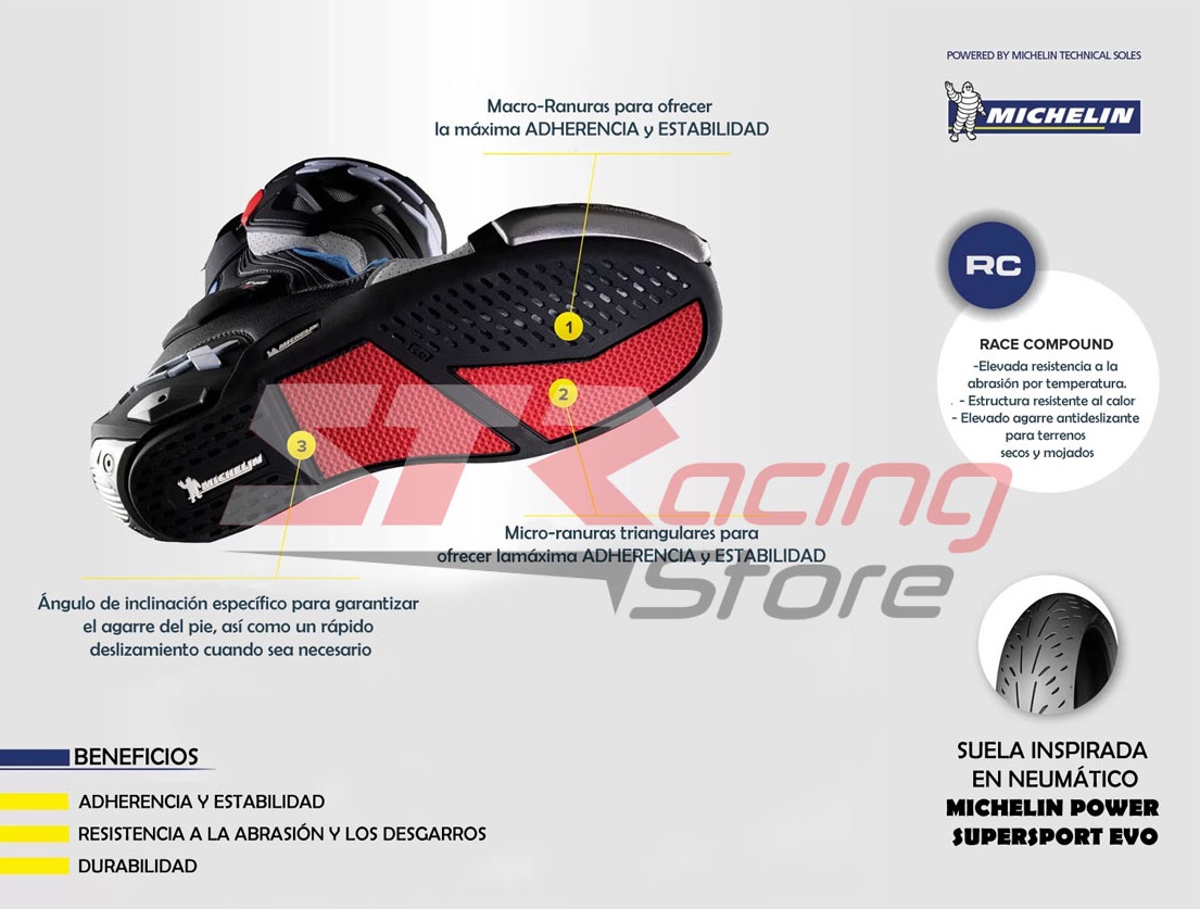 Las Botas estilo racing de TCX RT-RACE PRO AIR NEGRO cuentan con un sistema antitorsion "Double Flex Control" que ayuda a reducir el riesgo de sufrir un esguince de tobillo. Sus deslizaderas anteriores y posteriores en magnesio son sustituibles y resistentesa la abrasión, asegurando asi un desplazamiento más natural en caso de caída. Su talón esergonómico en poliuretano, con inserción lateral en magnesio, sustituible y resistente al desgaste. Cuenta con la caña en microfibra perforada, obteniendo así una ventilación óptima.Dispone de protección térmica en microfibra gamuzada, aportado un mejor agarre a la motocicleta. Dispone también de un collarín superior en enave microfibra para un mayor hermetismoa mayor velocidad, un sistema de abrochado interno Fasten FitControl, para una mejor fijación de conducción. Forro Air tech en malla transpirable. Protección del cambio en poliureretano termoplástico. Cierre lateral externo con cremallera y panel elástico. Hebilla microregulable de aluminio. Plantilla Ortholitecon amoçrtiguación duradera y altamente transpirable. Entresuela en polipropileno con espesores diferenciados. Suela MichelinBurnout con goma de composición doble, para una mayor duración y control de la moto. (Clica en el nombre para abrir la imágen y descubrir más)